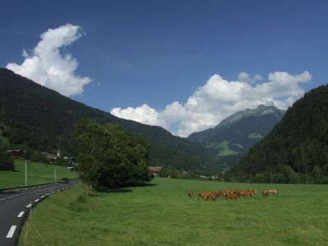 Egyre inkább alpesivé vált a táj hangulata, bár még nem voltak nagyok a hegyek. Szép helyeken tekertem a folyóparton, aztán egy kissé elkeveredtem, és csak jó sokára találtam meg magam a térképen újra, hogy hol is vagyok. Jó meleg lett, de sehol nem tudtam vizet vételezni, végül egy helybéli megtöltötte a kulacsokat. Ez jó is volt, mint kiderült, mert nagyon meredeken indult meg a kiválasztott út, a kaptatón hamar kiszáradtam volna a melegben víz nélkül.