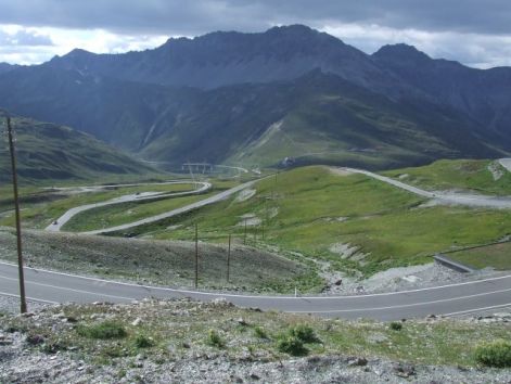 Elindultak a szerpentinek is csakhamar! Nem kellett sokat tekerni, de a fáradtság miatt keménynek tűnt. Egy páros is megelőzött közben, kevéske cuccal málházott országútival voltak. A hágóban a szinte kötelező csúcsfotó elkészítése után beszélgetésbe elegyedtem velük. Mondták, hogy az Albula hágó felé mennek, de kissé aggódnak, mert cudar arrafelé az időjárás már két napja. Igaz ami igaz, már az Ofenpass-on sem volt az az igazi nyár, a távolban pedig még komorabb felhőket lehetett látni, mint azok, amelyek eddig kísértek utamon. Mondtam nekik, hogy én a Flüela-ra megyek, biztos, hogy ott sincs valami jó idő. Igen, azt hallották, hogy ott még havazott is. Na jó, mondom nekik, talán nem vészes, még 2100 sincs. Dehogynem, majdnem 2400, válaszolták. A francba, a hajtásnál elmosódott a 3-as 0-ásra, 2383 a valódi szám! Jobban megnéztem, tényleg hármas. Tököm tele, 300 méterrel magasabbra mászhatok. Na de sebaj, inkább kevés szöveg, sok tekerés a recept az ilyen helyzetek megoldására!