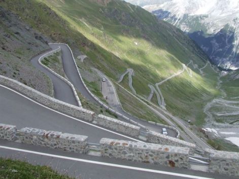 A fák között tekerve egyre fantasztikusabb lett a kilátás. Messze mögöttem az Ötztaler-Alpok magasodott, előttem meg az Ortler kezdte átvenni az uralmat a völgyben. A szerpentineken haladva többször is megálltam fotózni és pihenni, többször csatlakozott hozzám egy-egy maradék csúcshódító országútis. Az a tény, hogy teljesen üres karbonszálas gépeik nyergében néhányan levegőt is alig kaptak, nagy erőt adott. Aztán a fahatár környékén az út hirtelen kibukkant a völgy felső részébe egy hotelnél (Berghotel Franzenshöhe), és én megláttam mi vár rám még. A meredek hegyoldalban kígyózott felfelé a szerpentinek végtelen sora. Ilyet ritkán lát az ember! Fantasztikus, de egyben félelmetes és kissé lelombozó látványt nyújt egy fáradt kerékpárosnak.