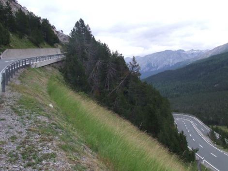 Gurulni kezdtem. A gurulás csakhamar újabb emelkedőbe ment át, utána folytatódott a lejtő. A hágótól számított 22km után értem Zernez nevű faluba, ahol jobbra kanyarodtam az Inn völgyébe. Szép kis folyócska! Mivel folyásirányba tekertem az elkövetkező 6 kilométeren, nem volt veszedelmes az erőkifejtés. Aztán Susch nevű faluban kellett balra kanyarodnom a tegnap este óta 300 méterrel magasabbra növő Flüela hágó felé. A faluban azért még ebédeltem is egyet egy padon, aztán úgy döntöttem, hogy a hágó minél hamarabb történő meghódításának egyetlen módja az indulás.