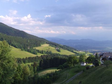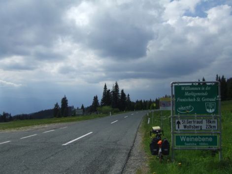 A lejtő alján, St. Gertraud-nál fordultam balra Wolfsberg irányába. Mivel még csak fél 6 felé járt az idő, a tervem az volt, hogy felmászom a Koralpe útján csomagokkal ameddig csak muszáj, és ahol egy alkalmas éjszakázóhelyet találok, otthagyom a cuccokat és üres géppel folytatom a Grosser Speikogel-re. Wolfsbergen áttekerve könnyedén megtaláltam az utat, de sajnos az alkalmas hely csak nem akart megjelenni. Az órám szinte megállás nélkül 10-13%-ot mutatott, csomagos kerékpárom nyergében megtett aznapi Weinebene-mászásom nyomai sem múltak el combjaimból, így nem mondom, kellemetlenül érintett a kilátástalan keresgélés. Aztán majdnem 3 km-re az elágazástól (ez a 3 is soknak tűnt) végül megtaláltam az ideális helyet. Ettem néhány falatot, aztán a cuccokat a bokorba rejtve felfelé indultam, mert már esteledni kezdett.