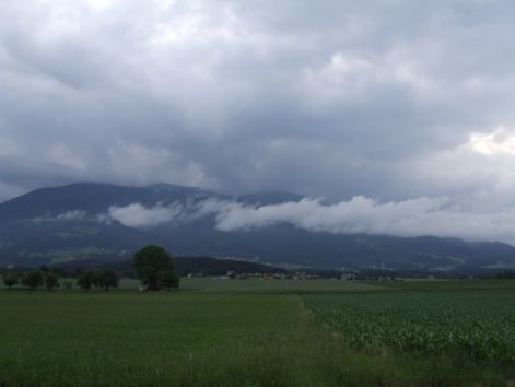 Legurultam a meredek lejtőn. A tájban gyönyörködve meg kellett állapítanom, hogy a tegnapi állapotokhoz képest jelentősen eluralkodtak a komor felhők. Szinte úsztak a hegyek között. Én meg a látványban fürödtem. Vasárnap lévén egyébként sem számíthattam nyitott boltra Ausztriában, de Pünkösd vasárnap teljesen kizárt volt! Így a következő benzinkútnál St. Andra-ban vettem egy ásványvizet és reggelire egy kakaót. Úgy döntöttem tekerek még néhány kilométert, mielőtt megállnék reggelizni. Hangulatos völgyben gurultam Lavamünd felé a főúton. Nem volt nagy forgalom. St. Paul-ban reggeliztem meg.