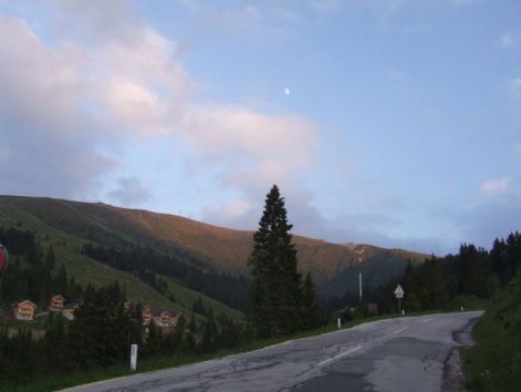 Azonban kb. 1660m-en egy épületegyüttesnél (síközpont) lévő parkolónál ahogyan befordultam, le volt zárva az út egy sorompóval. Egy behajtani tilos tábla is feszített előtte, rajta kiegészítésképpen egy másik tábla: kerékpárosokra is érvényes! Megkérdeztem egy közelben álló embert, hogy mi ez, azt válaszolta, hogy nem lehet továbbmenni, de azt ő sem tudja, hogy pontosan miért is. Nem lehet és kész. Leírhatatlan csalódás lett úrrá rajtam. Most kerüljem ki és „szökjek" fel? Az nem lenne tiszta játék. Ha nem lehet, akkor nem lehet. Vártam egy negyed órát, hátha kitalálok valamit, de aztán nagyon elkezdtem fázni, inkább visszaindultam. Kényesek az ilyesmire az osztrákok. Hallottam már mástól is, hogy elkapták egy erdészeti úton. Visszagurultam. Tábort bontottam és gyors vacsora után csalódottan hajtottam álomra a fejem.