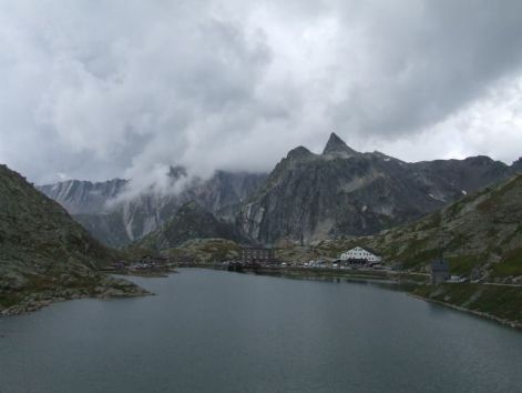 Egyre feljebb jutottam, lassan el is hagytam a 2000m-t, utam során már 13. alkalommal. Már lentről is látszott erre néhány házikó, de azt tudtam, hogy ez még messze nem a hágó. Ezen a ponton még elképesztőbbé vált a táj, ide-oda kapkodtam a fejem a látvány miatt. Egy kis alagút után fordult egyet az út balra, és meg is érkeztem a hágóba, ahol egy tó, valamint több ház és egy rakás ember fogadott. Itt is, csakúgy mint a Petite Saint Bernard-on rengeteg plüss bernáthegyi kutyát árultak, minden méretből választani lehetett. Eltekertem a hágó svájci oldalára, ahol felöltöttem az esőkabátomat, mivel szemerkélni kezdett az eső. Kis ideig nézelődtem csak, aztán meg is indultam Svájcba.